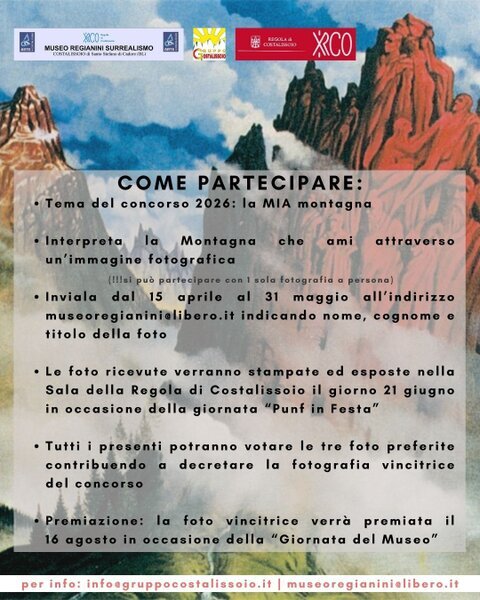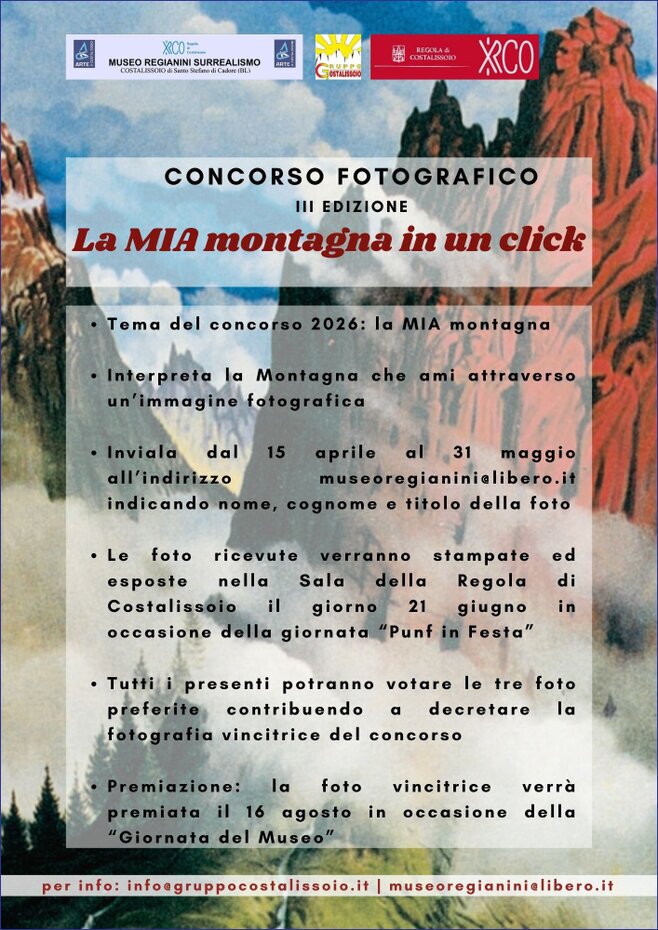 ORGANIZZATORI - Il Concorso fotografico (“La MIA montagna… in un click”), terza edizione (la I, nel 2024, è stata dedicata ai fiori di montagna, la II, nel 2025, dalla rosa), è promosso dalle Pubbliche Relazioni del Museo Regianini Surrealismo, in collaborazione con la Regola di Costalissoio e con il Gruppo Costalissoio.