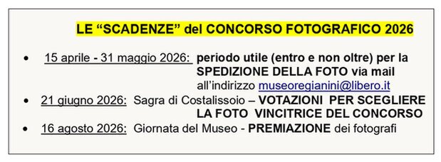 PREMIAZIONE - Una sola foto risulterà vincitrice del Concorso, quella che otterrà il maggior numero di voti complessivi (“giuria popolare” più “giuria organizzativa”), ma, nella Giornata del Museo (16 agosto 2026) le prime 3 foto classificate saranno premiate: riceveranno, oltre all’Attestato di partecipazione, una litografia del Pittore Regianini, donata dagli eredi. Al fotografo/a vincitore verrà, inoltre, riservata la coppa, realizzata ad hoc. Lo scatto vincitore del Concorso, stampato in dimensioni abbastanza grandi (formato A3 o superiore), sarà esposto nel Museo di Costalissoio, il 1º luglio 2026, e ivi rimarrà in visione fino al 30 giugno 2027.