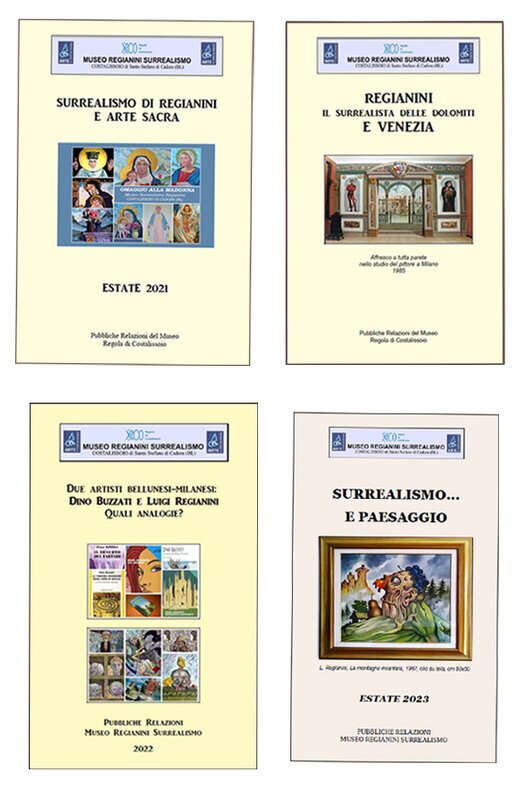 2022 - "DINO BUZZATI E LUIGI REGIANINI: quali analogie?" (48 pp.). Si comincia con un parallelo tra il poliedrico Buzzati e il Pittore surrealista. I due artisti si sono incontrati varie volte a Milano ed hanno condiviso idee sull’arte e sulla vita in questo nostro “assurdo” mondo. Facendo riferimento alle loro opere (che citiamo per dare forza probativa alle nostre affermazioni), abbiamo individuato diverse convergenze sugli interessi coltivati e sulle scelte artistiche. Entrambi vivono stabilmente a Milano e, d’estate, nel bellunese, nelle case di famiglia. Città e montagna sono i due poli attrattivi della loro esistenza. E ntrambi vedono l’arte, oltre che come fruizione godibile nell’immediato, anche come mezzo validissimo per comunicare messaggi, carica di scopi didascalici.